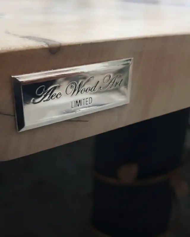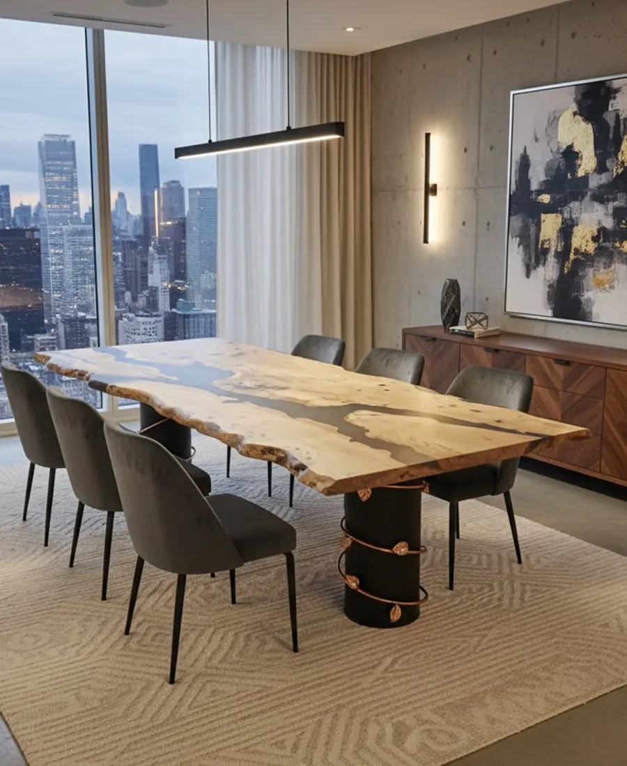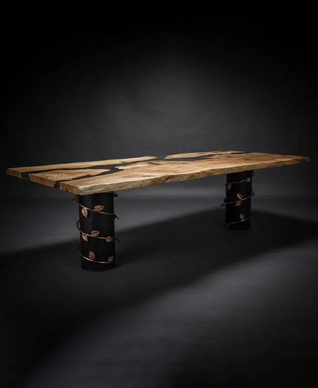 Modern industrial dining table with live-edge wood and cylindrical black metal legs with decorative rings.