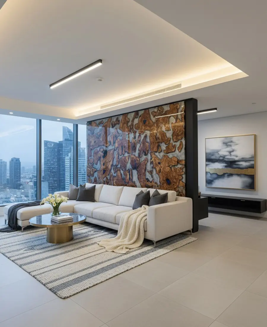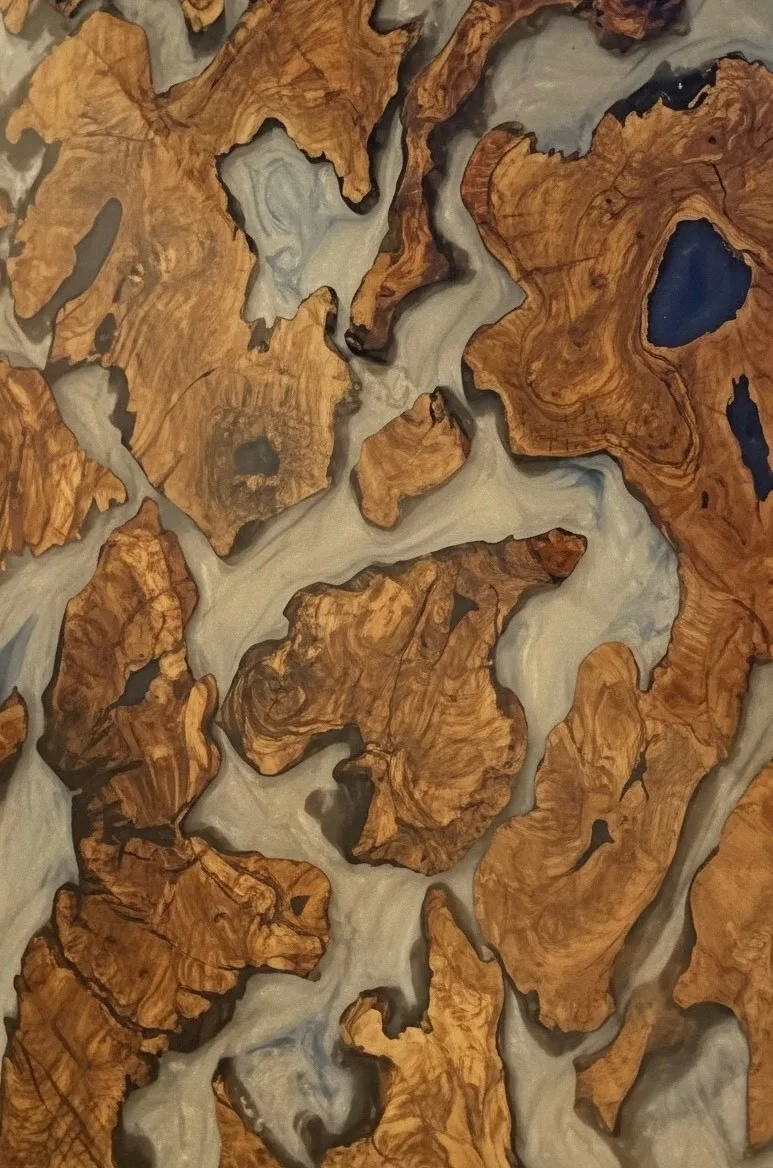 Handcrafted artistic wall feature made from natural olive tree roots combined with royal blue and pearl epoxy. A breathtaking design statement that brings depth, luxury, and character to premium interiors such as living rooms, penthouses, hotel suites, lobbies, and executive offices.