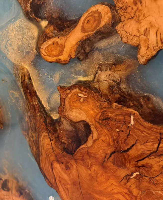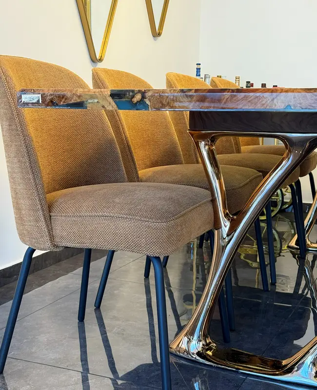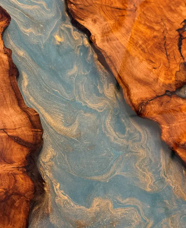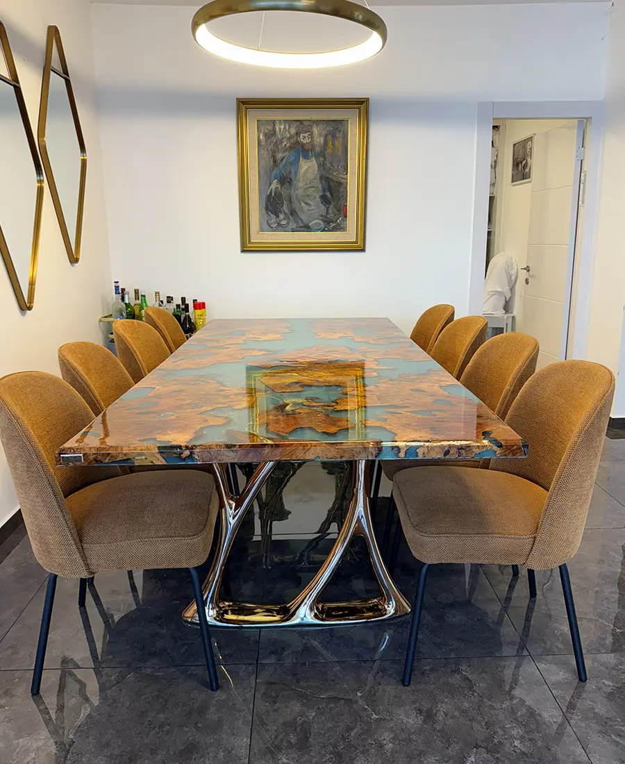 An artistic statement piece combining solid wood with epoxy in turquoise-blue-gold tones. Chrome curved metal legs deliver a luxurious modern presence.