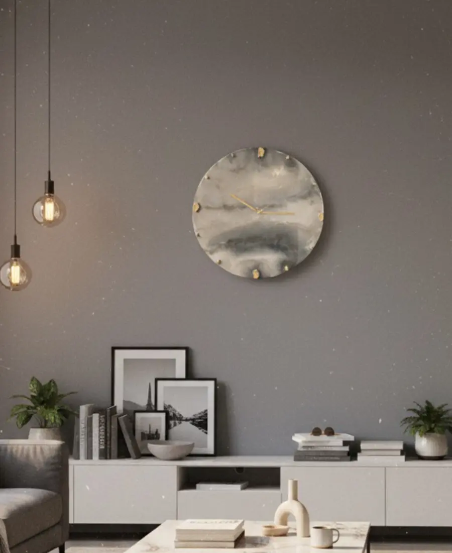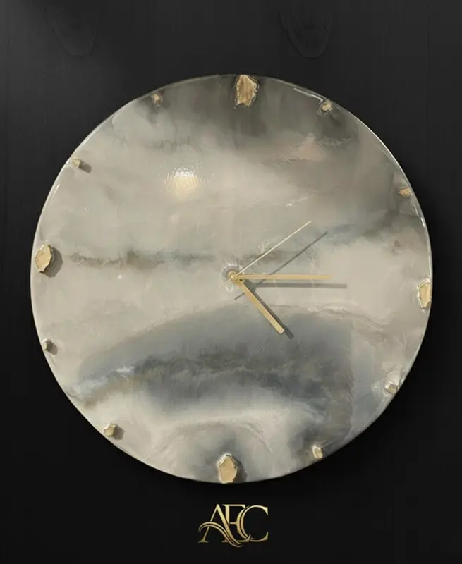 Premium handcrafted epoxy wall clock, inspired by calm cloud formations and natural stone textures. Designed with pearl & smoky grey epoxy and refined gold accents, creating a luxurious floating aesthetic perfect for modern and minimalist interiors.