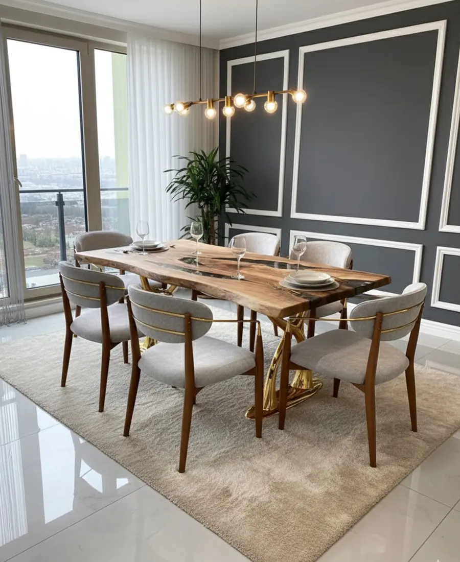 Solid natural wood dining table with elegant Y-shaped metal legs in gold finish. A timeless and sophisticated design piece.