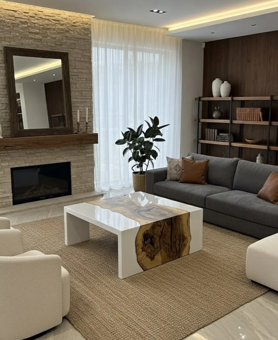 Contemporary coffee table combining a white geometric base with a natural wood slab and clear epoxy details for a clean and luxurious look.