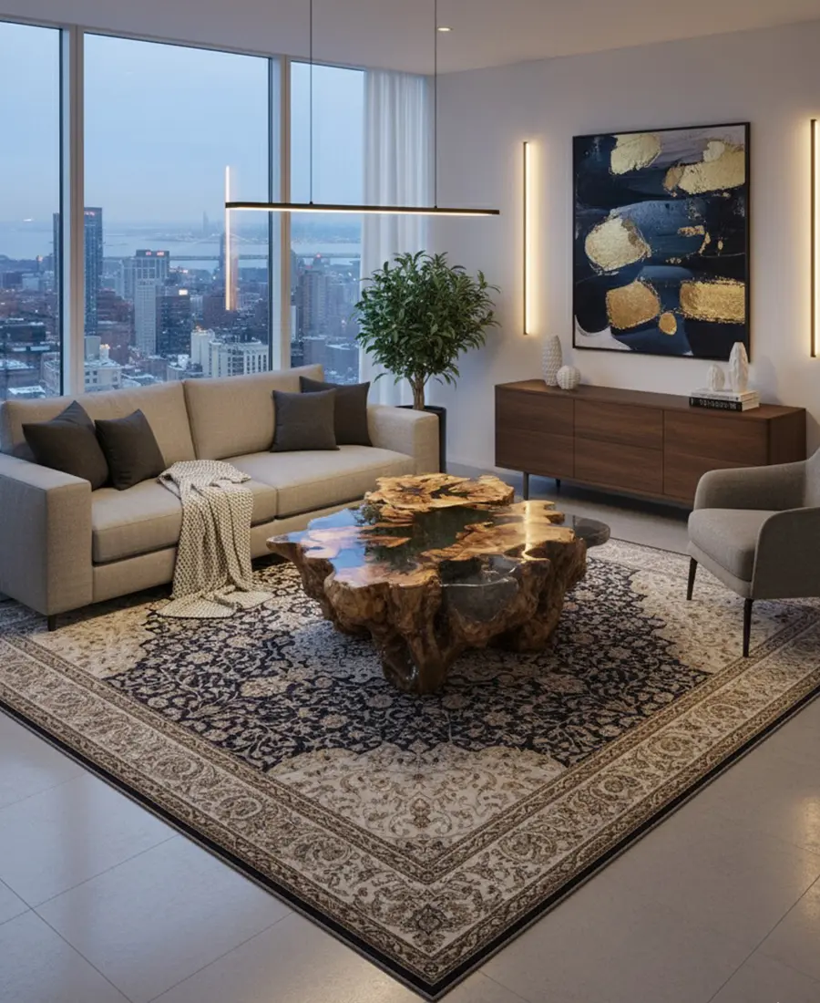 Exclusive sculptural coffee table made from massive natural root wood with a glass top, creating a bold artistic centerpiece for premium interiors.