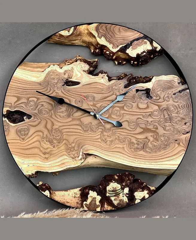 Luxury handcrafted wall clock designed from natural olive root wood, set inside a round metal frame for a modern architectural look. The raw organic shapes of the wood create a stunning artistic centerpiece that brings richness and character to any space.