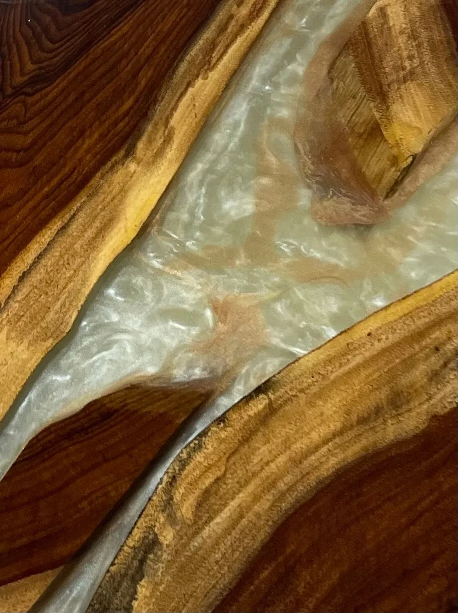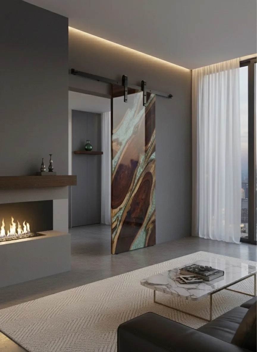 Handcrafted artistic barn door made from natural Indian Rosewood combined with green epoxy infused with subtle copper accents. A breathtaking design statement that brings depth, luxury, and character to premium interiors such as living rooms, penthouses, hotel suites, lobbies, and executive offices.