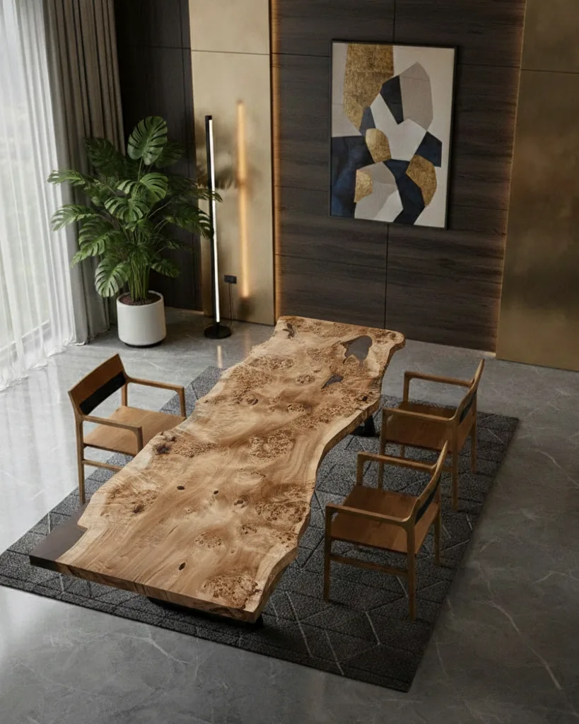 A solid poplar dining table showcasing the wood’s bold natural character and flowing live edge. Finished in matte lacquer and supported by trapeze metal legs, it brings refined presence to expansive interiors.