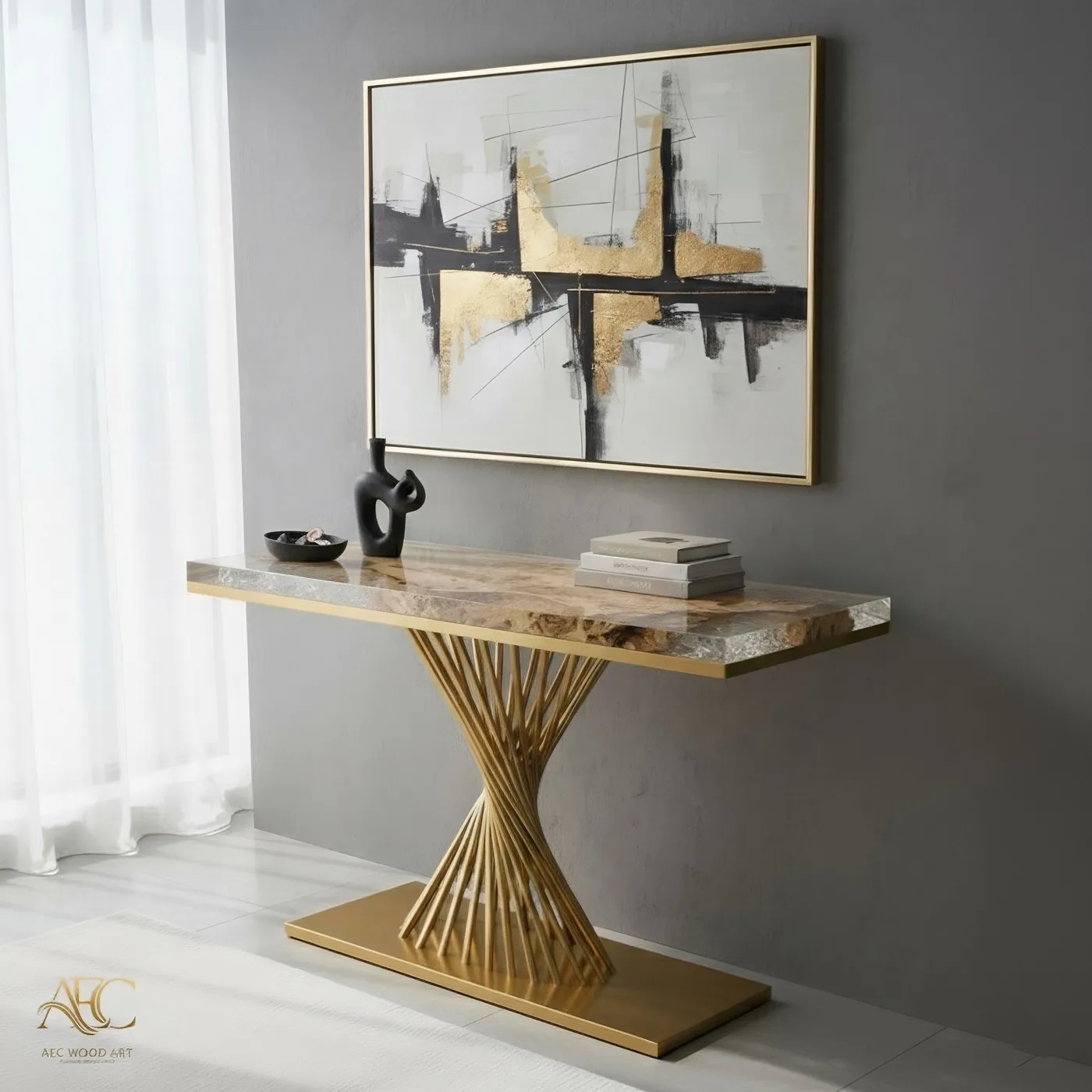 A handcrafted luxury console table featuring Poplar wood combined with crystal-clear ice-texture epoxy, elevated by an elegant sculptural gold metal base for a refined modern statement piece.